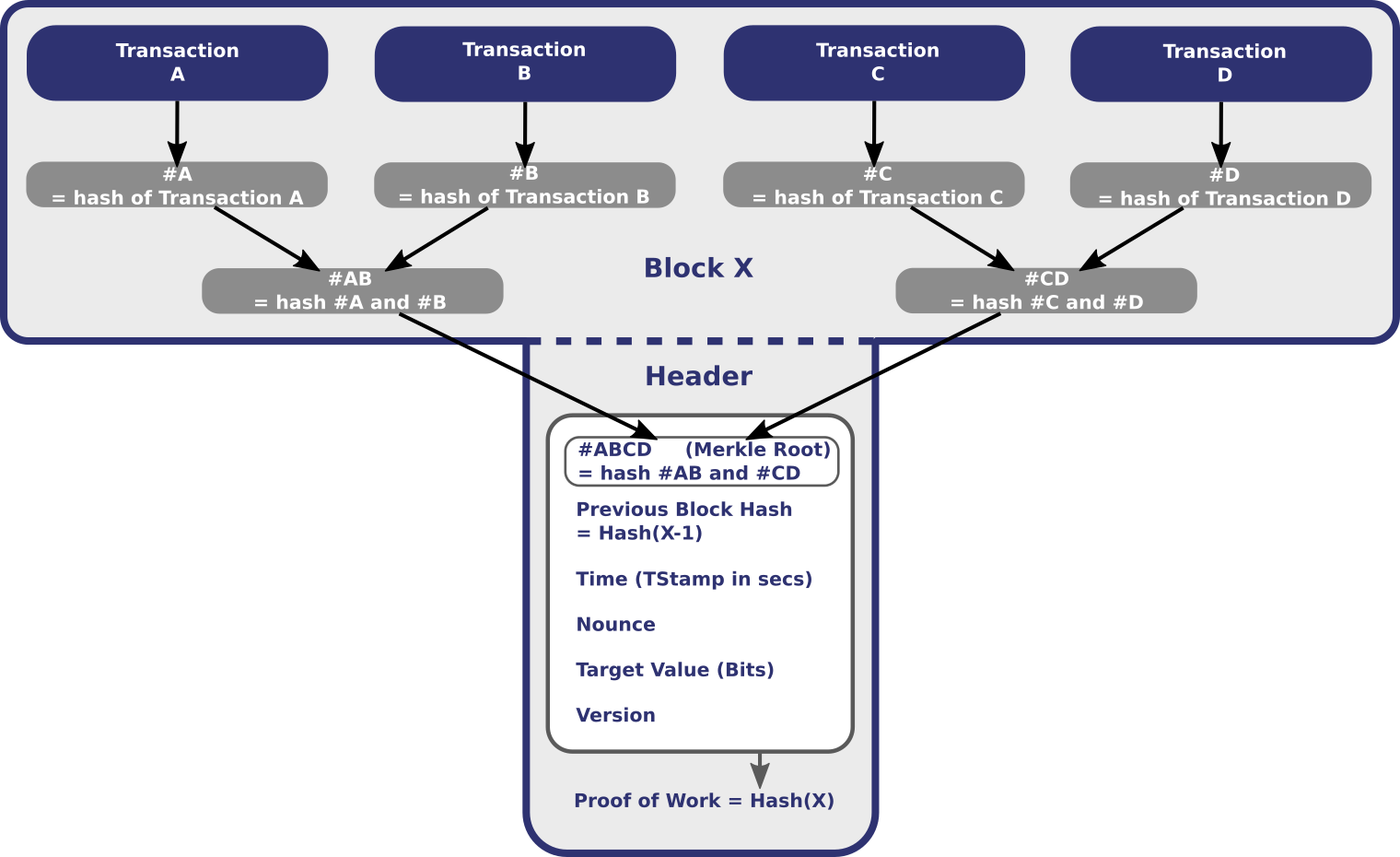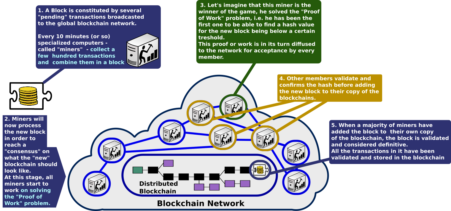 Each block contains, among other things, a record of some or all recent transactions, and a reference to the block that came immediately before it. It also contains an answer to a difficult-to-solve mathematical puzzle , the hash or "Proof of Work".