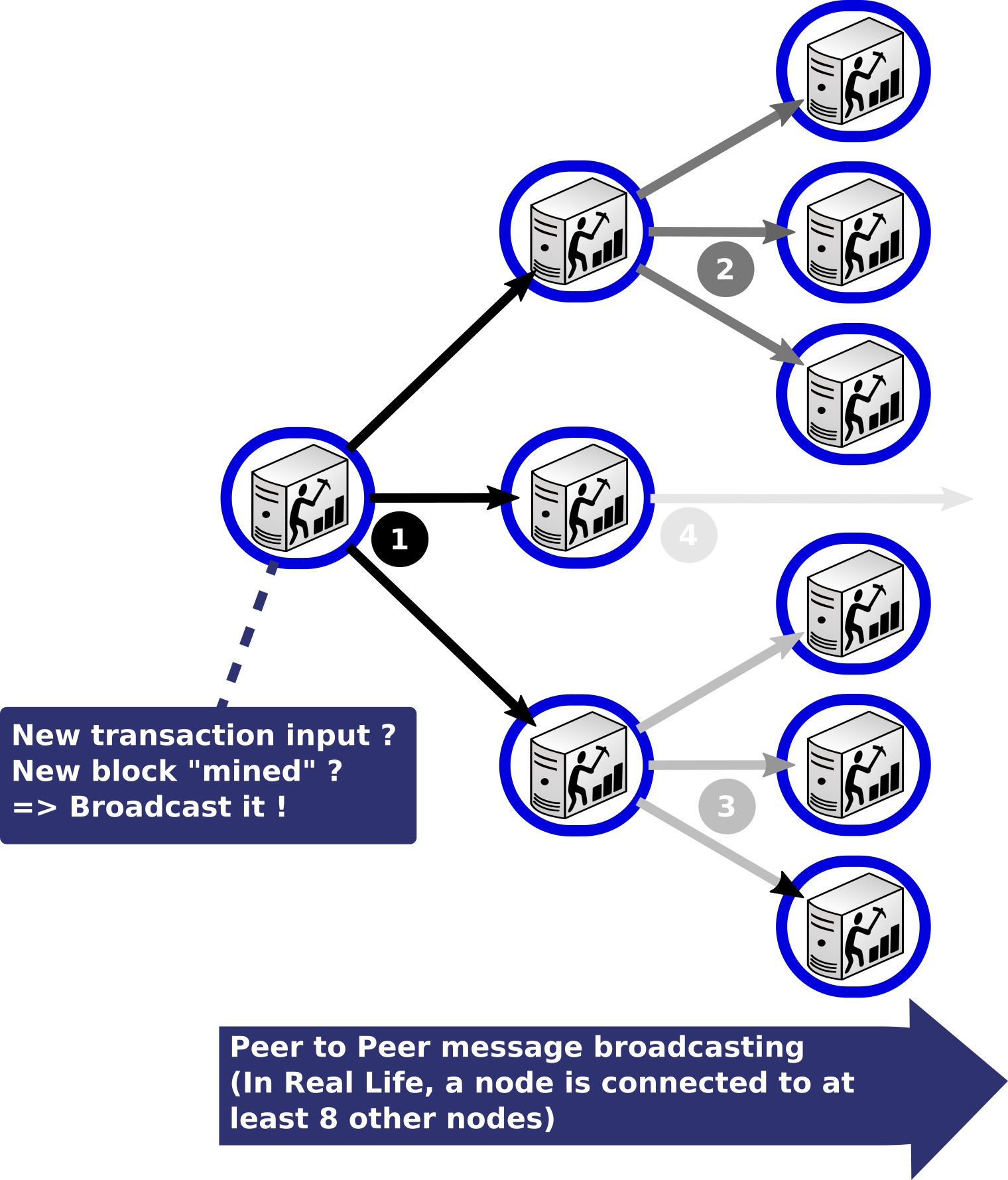 - The blockchain network is a peer-to-peer network of independent nodes communicating together by message broadcasting.