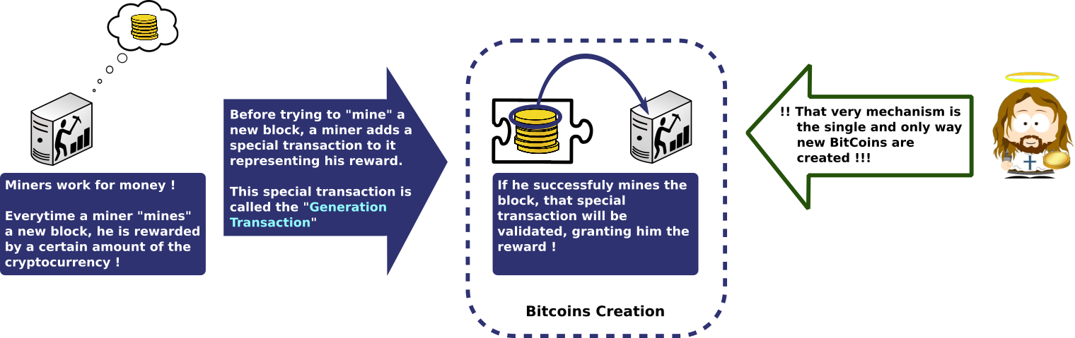 Because there is a reward of brand new bitcoins for solving each block, every block also contains a record of which Bitcoin addresses or scripts are entitled to receive the reward. This record is known as a generation transaction (or a coinbase transaction) and is always the first transaction appearing in every block.