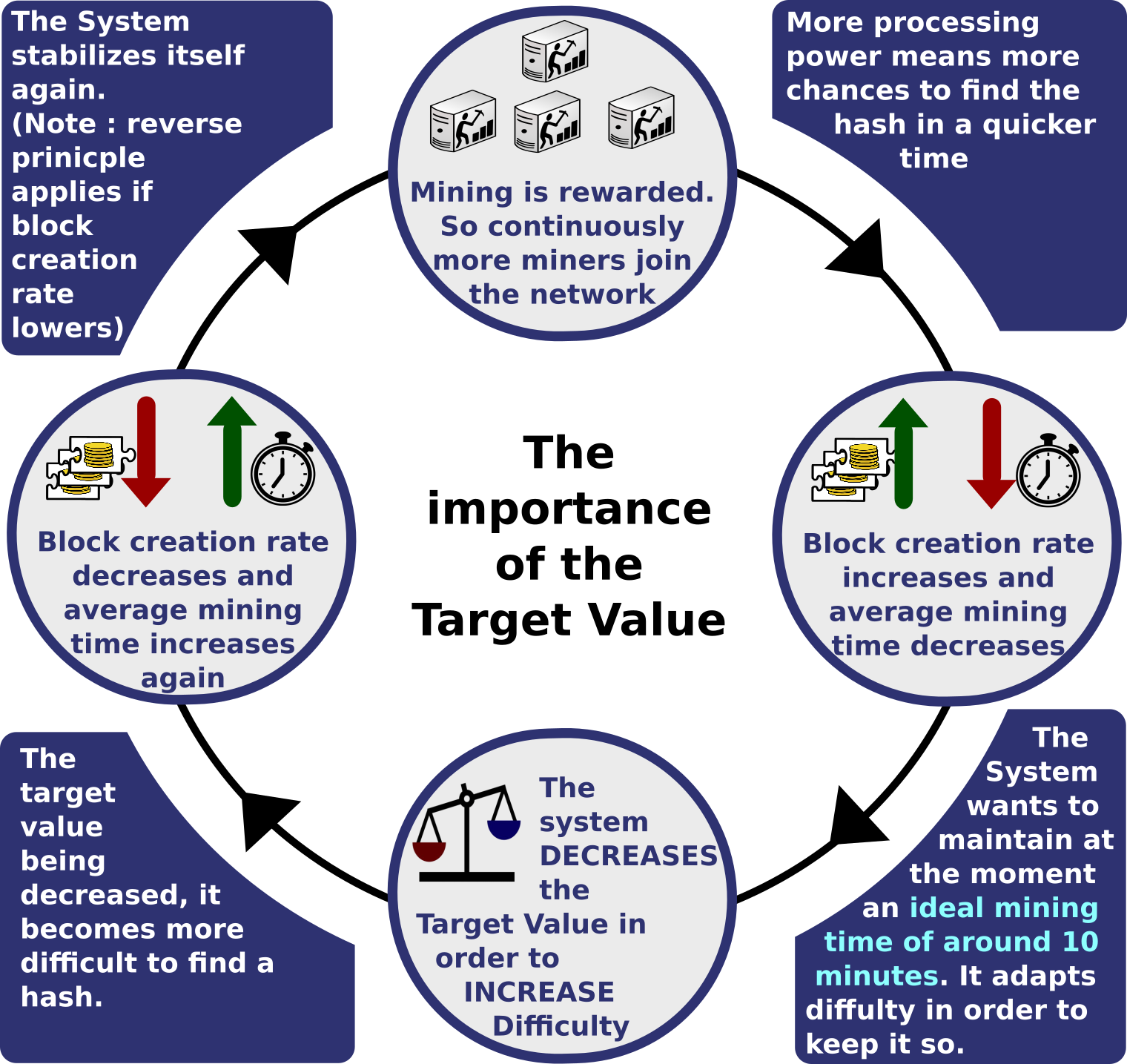 Again, the difficulty of the mathematical problem is automatically adjusted by the network, such that it targets a goal of solving an average of 6 blocks per hour.