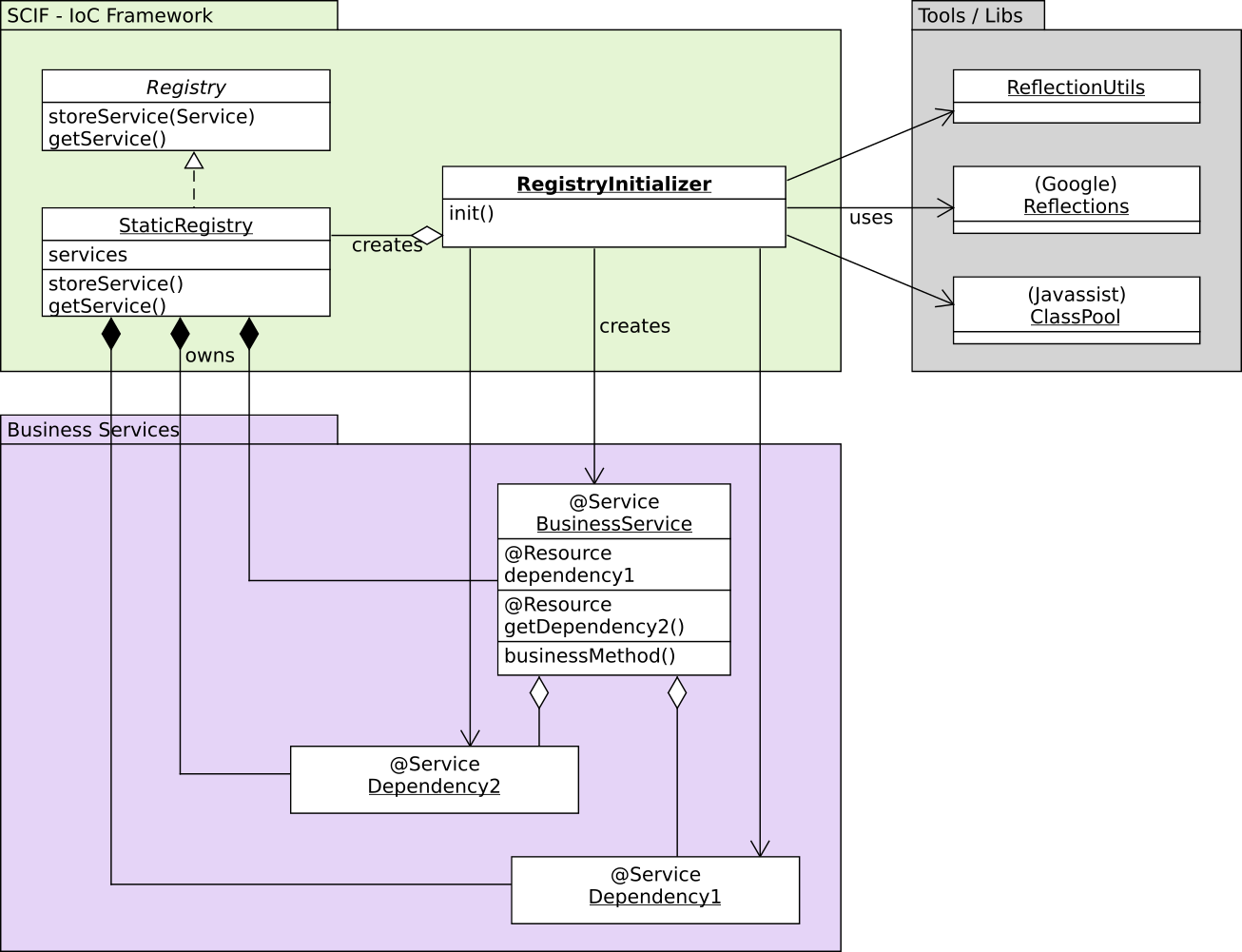 ReflectionUtils: a little helper class simplifying some operations related to Runtime Reflection.Reflections(org.reflection.Reflections) : a mandatory package when it comes to analyzing the classpath looking for classes declaring a certain annotation.Javassist: the bytecode manipulation library.