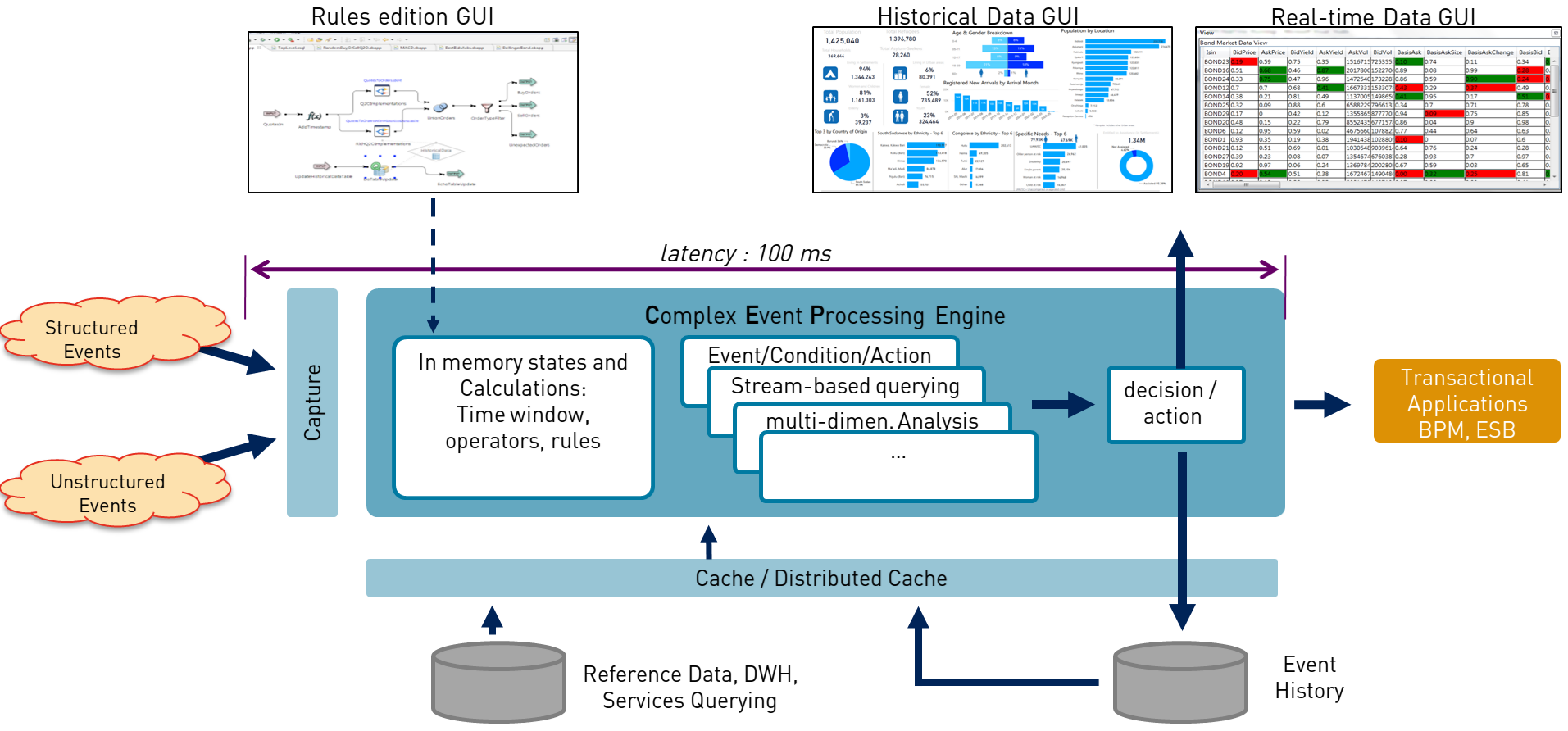 - Multiple data events or queries are logged in a queue to be catered against a distributed file system storage or history.