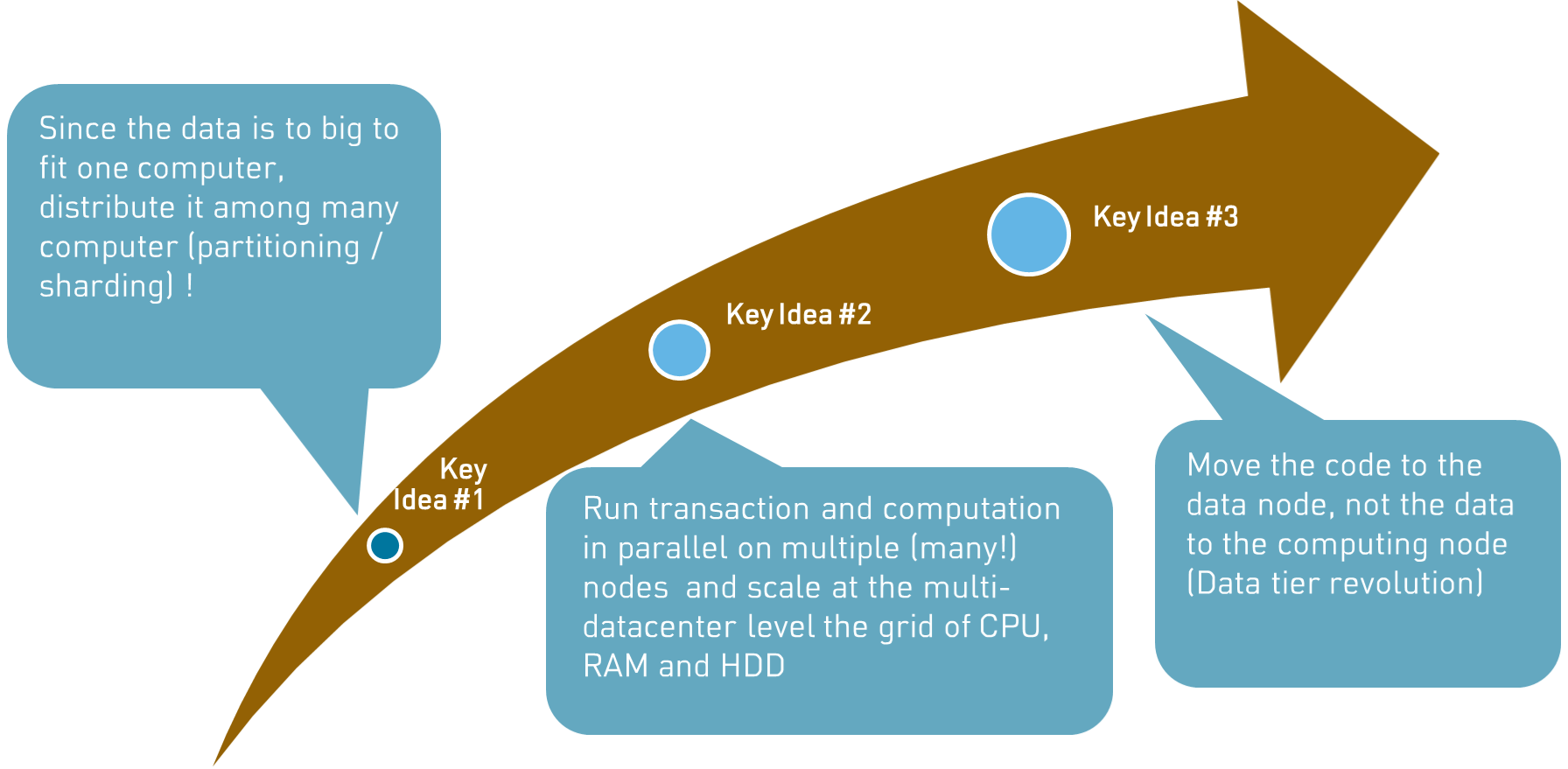 Key idea 3 : Data tier revolution - So we distribute both the data on a cluster of computers - or nodes - and the processing as well. We end up using the data nodes as processing nodes. This is the data tier revolution, which is in complete opposition to what was usually done so far in traditional architectures: fetching the required data to the place where the computation occurs.