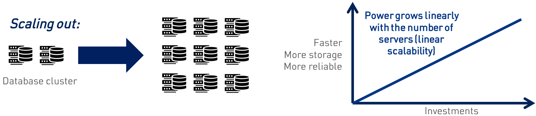 Distribution means partitioning the dataset - also called sharding it sometimes - but also always replicate the partitions or shards. We'll see exactly why and how later. - Key idea 2 : Horizontal scalability - Just as we split the data, let's split the computation and distribute it on as many nodes as are required to support the workload, even if it means multiple datacenters.