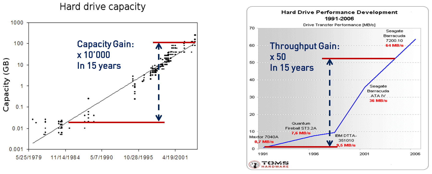 Let's consider a fifth dimension, too often left aside when considering the evolutions of computer technologies and hardware architectures: the throughput of the connection between the data on the disk (long term storage) and the memory (i.e. hard drive controllers mostly, but also buses, etc.)