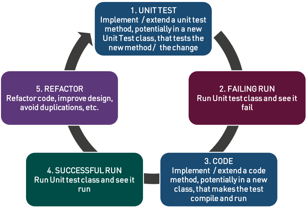 The principle of TDD is simple: when one wants to develop a new feature, one starts by writing the test that assesses how it shall work. In the next step, the functional code is developed so that the test is validated. And nothing more!