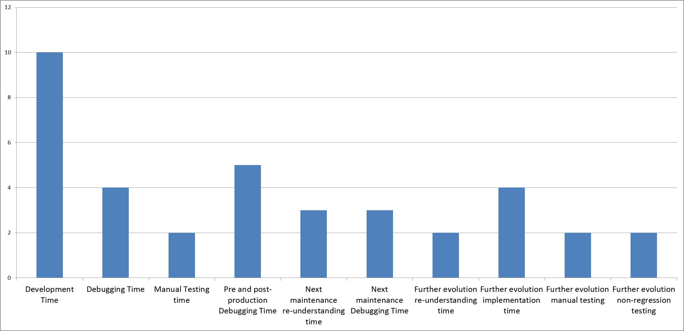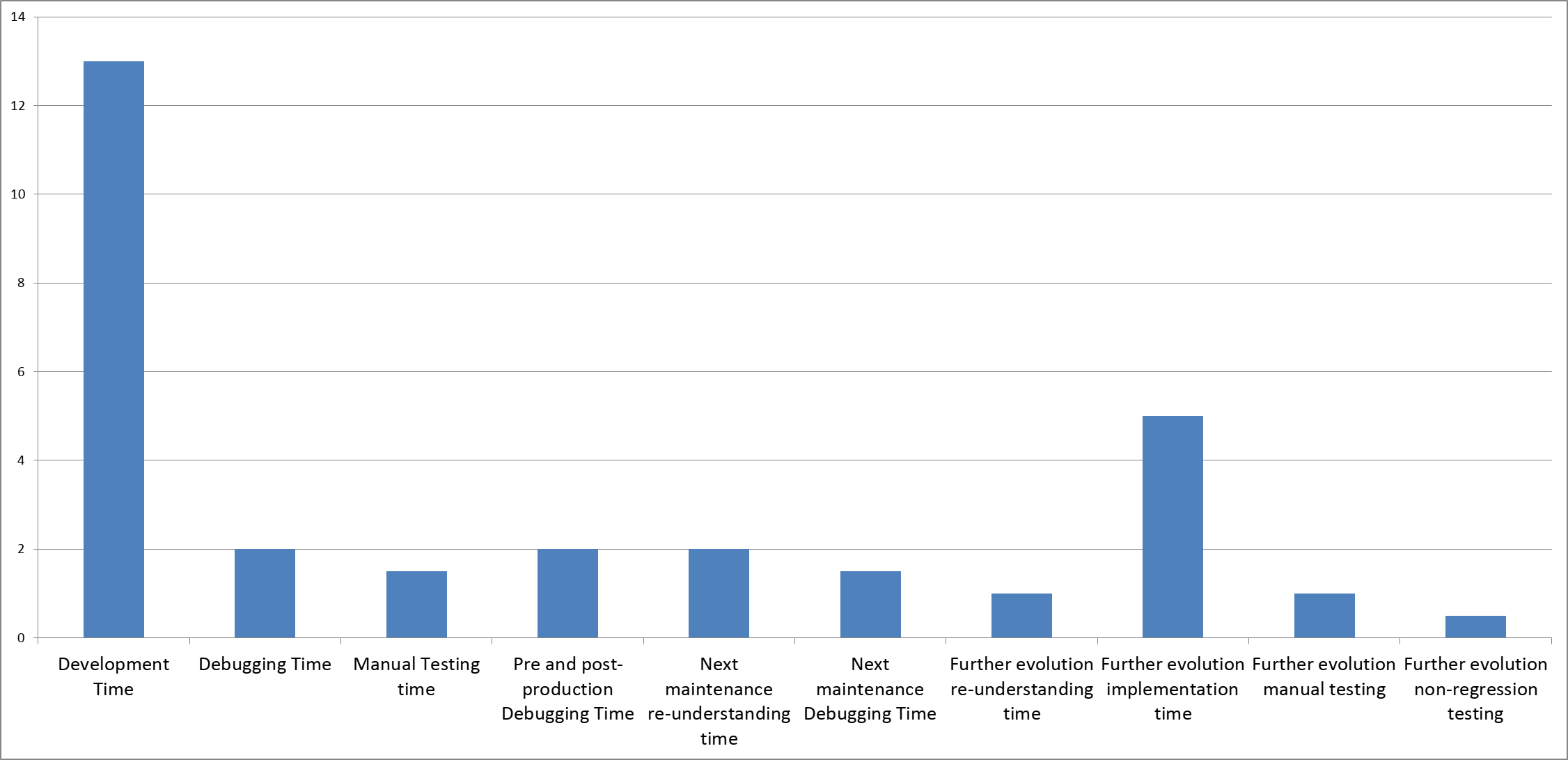 We can see that the actual coding cost ("Development Time" and "Further evolution implementation time") is only a tiny part of the whole development and maintenance lifecycle.
