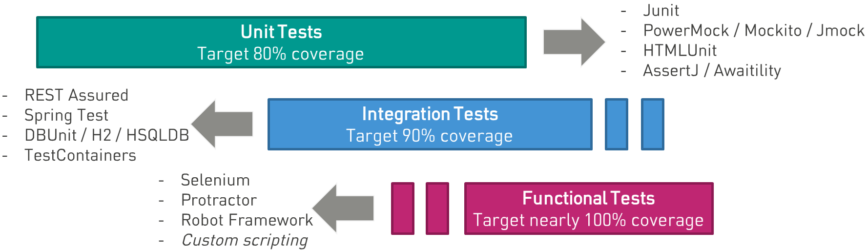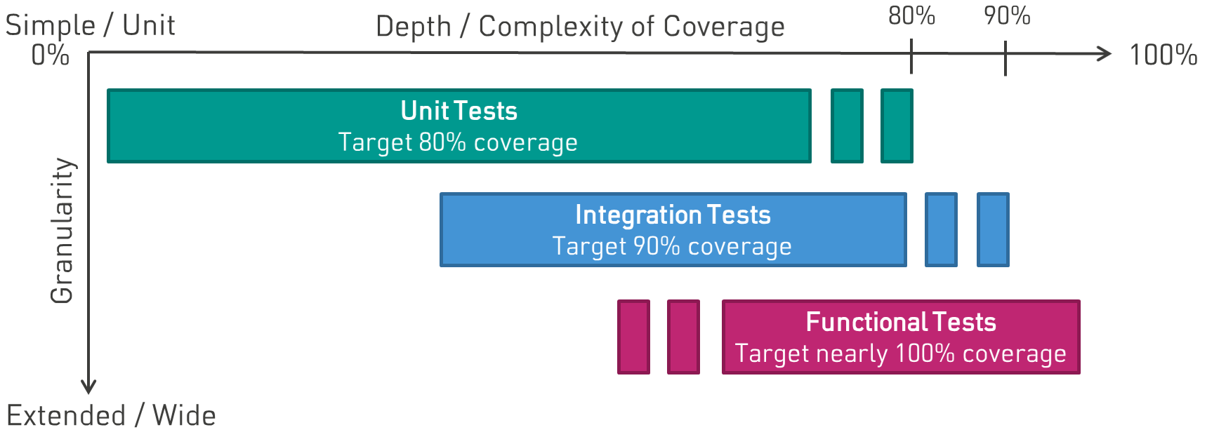 - Because of the previous problem, covering (nearly) 100% of the functional code with tests is overkill and one limits to the 80/20 rule.