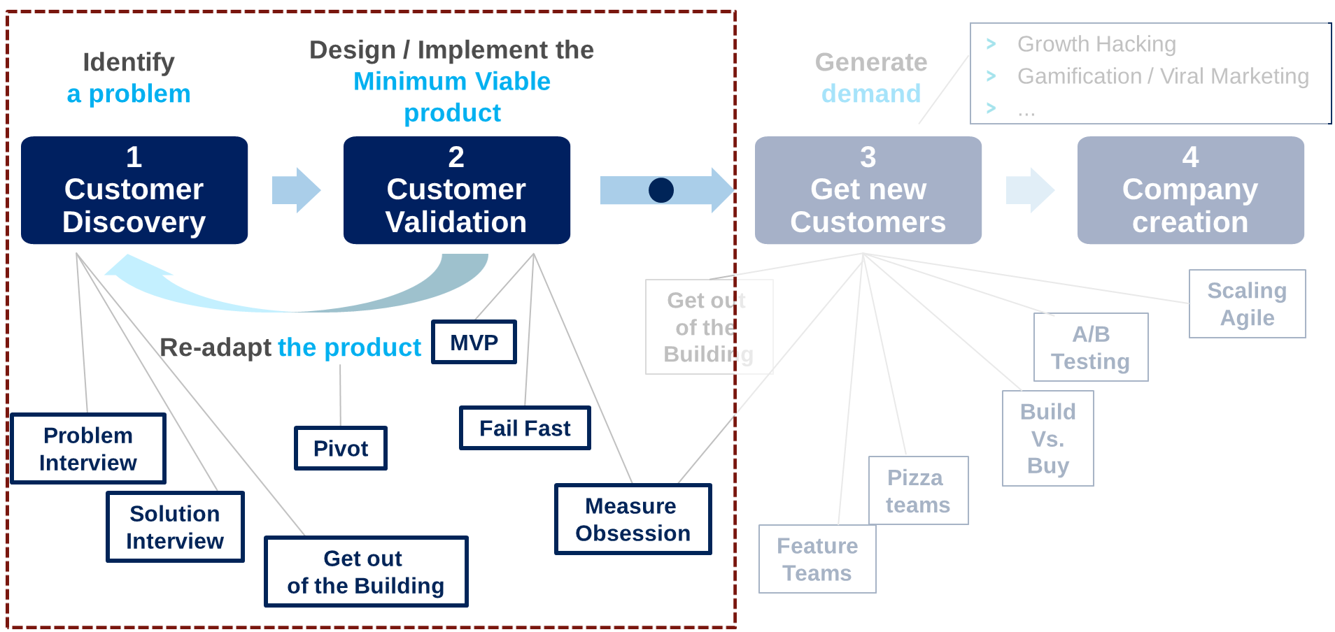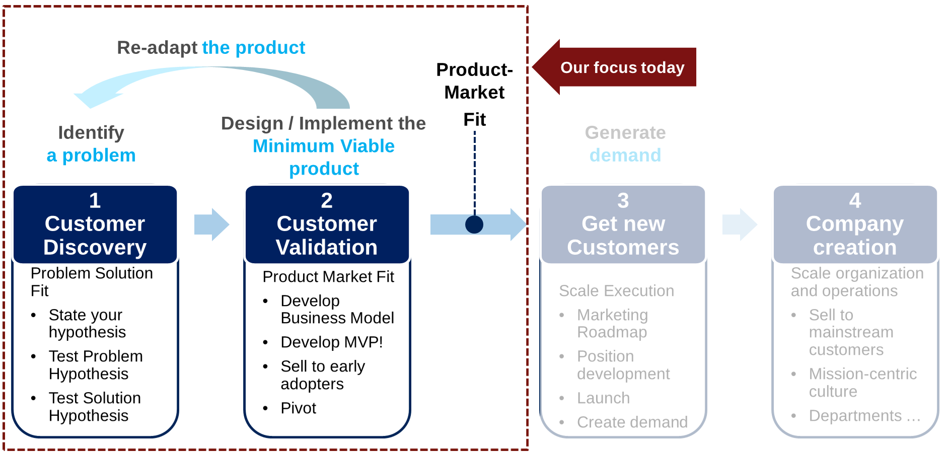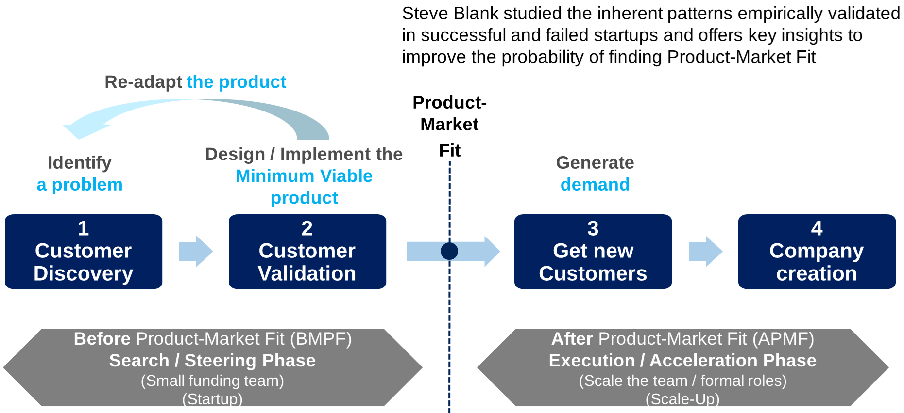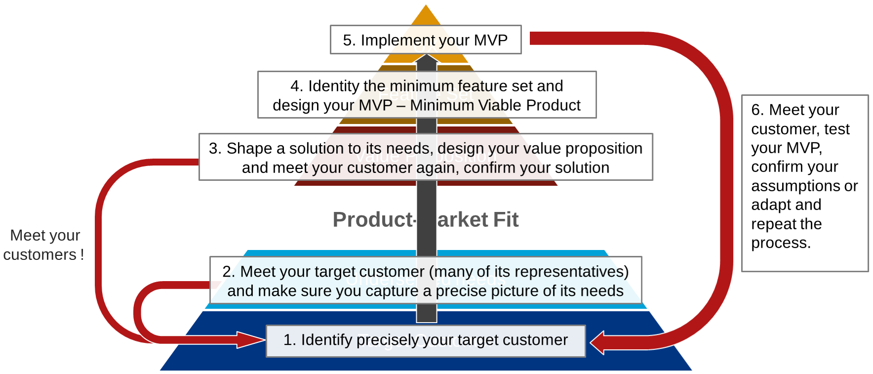 - Put MVP on the market, collect feedback on MVP and evolve / adapt / pivot as required until reaching Product-Market-Fit