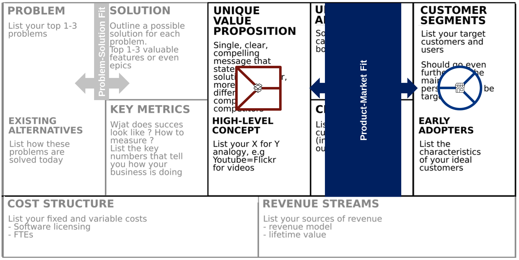 - Pre-Product-Market Fit, the startups needs to focus on the leanest possible ways to solve Problem-Solution Fit, define and verify its business model and eventually reach Product-Market-Fit.