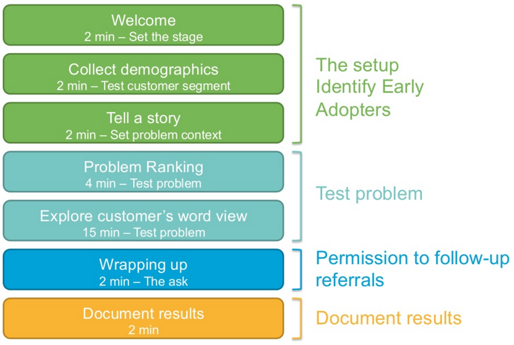 Hint: usually these are the ones around target segment, problems and market size. - (Problem Interview) Conduct a round of qualitative interviews with target customers, to understand if they have the problem, how big it is, and what they currently do to solve it.